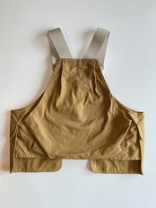 前面からサイドに渡るフラップ付きポケットと背面の大きなゲームポケットが特徴。フラップ付きポケットは、フラシポケット(上部のみ本体に縫い付けて浮いた状態)になっています。バタつきが気になるときは、ポケット裏にあるループのホックと固定できます。ホックを外すと、屈んだ作業時やバイクに乗る時などに、もたつきを解消してくれます。このループは何かと便利な役割を果たしてくれます!身幅にゆとりを持たせているため、アウターなどの上からでも着用しやすいサイズ感になっています。男性女性、大柄小柄なんて関係なく、さまざまなスタイルやシーンで楽しんで欲しいベストです。ショルダーベルトの金具やホックなどは無垢の真鍮を使用しているため、経年変化を味わえます。この「Hunt vest 02 short」は、サコッシュエプロンの装着はできません。